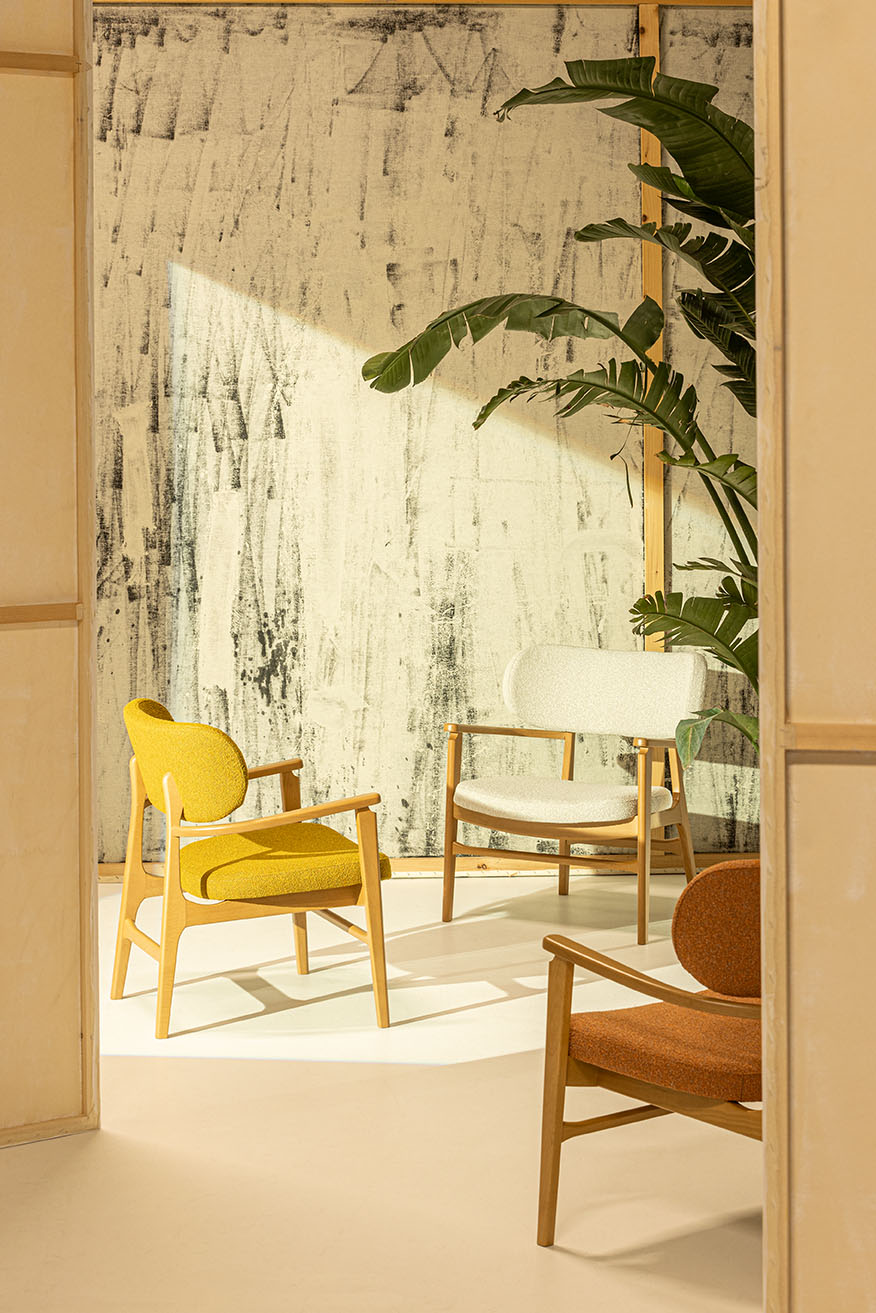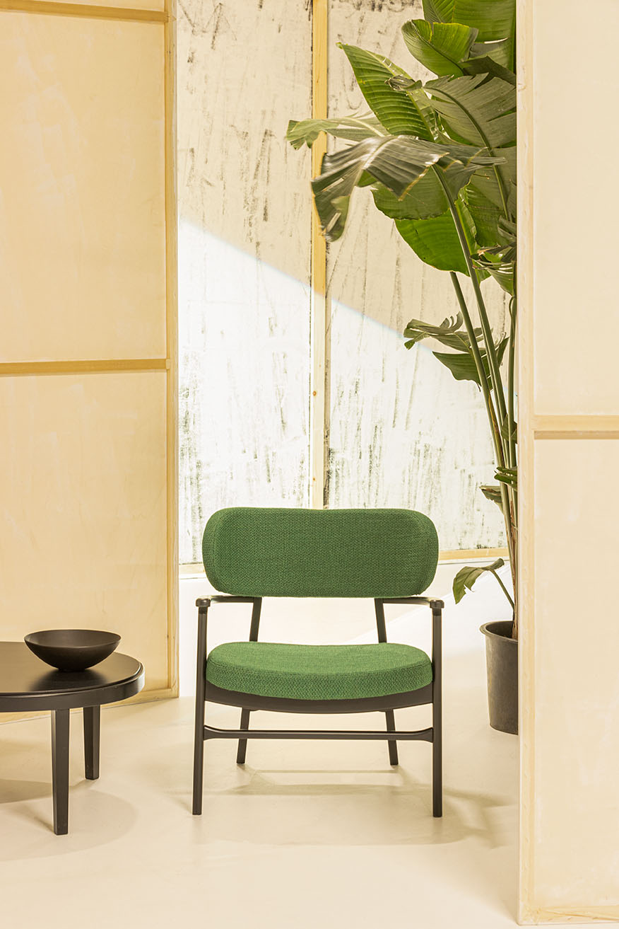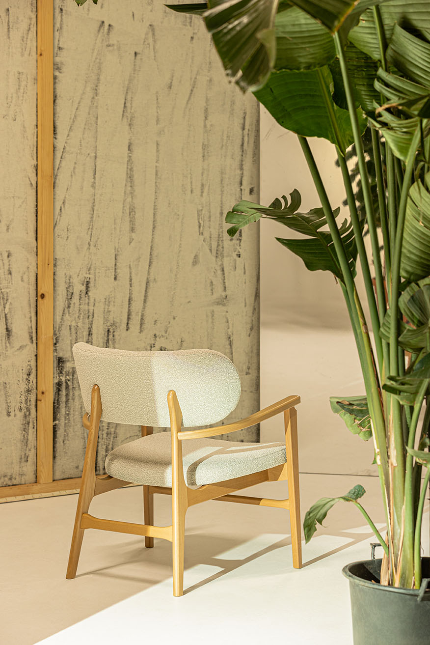 A new lounge chair with an upholstered seat and backrest, offering a contemporary design for lounge spaces.