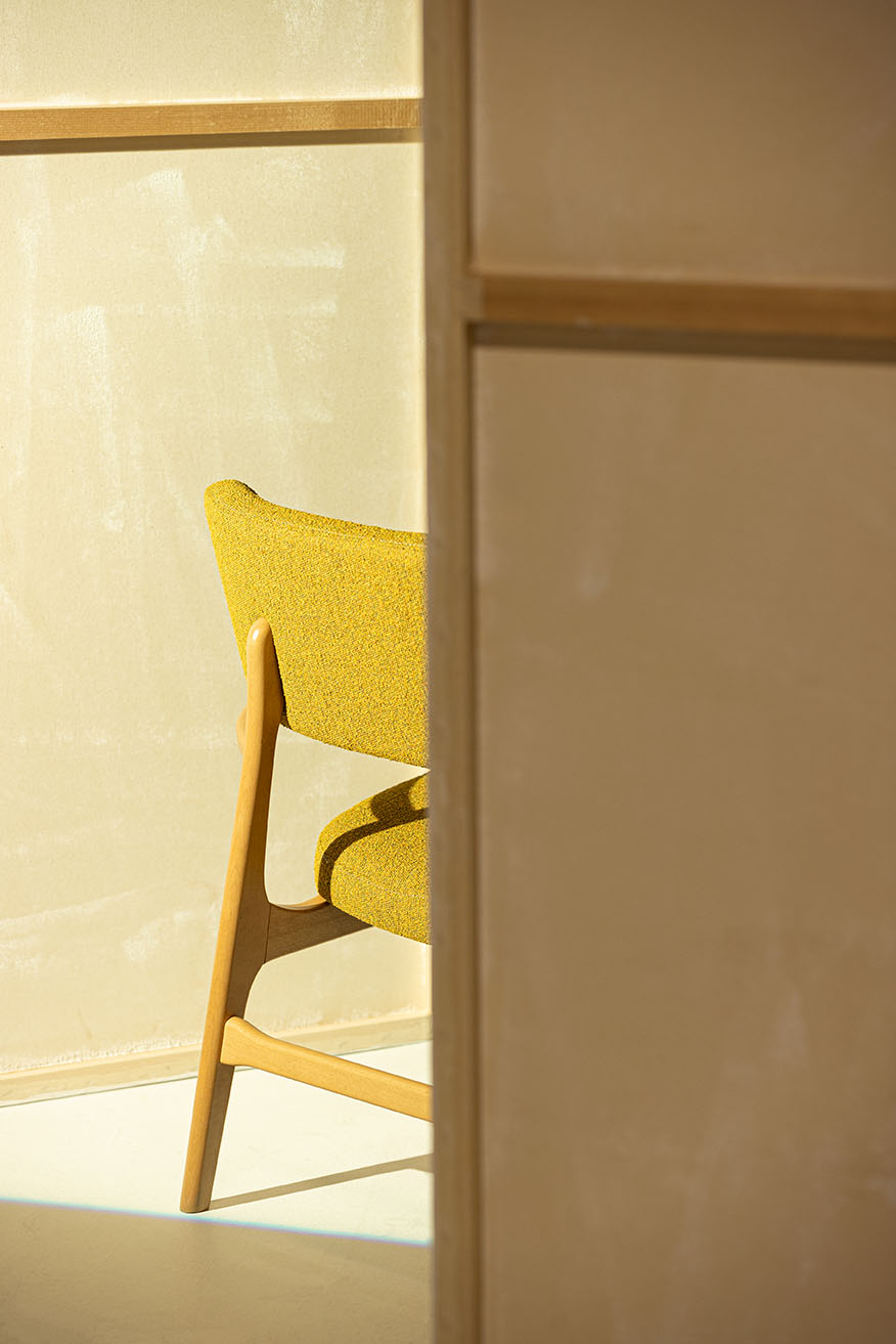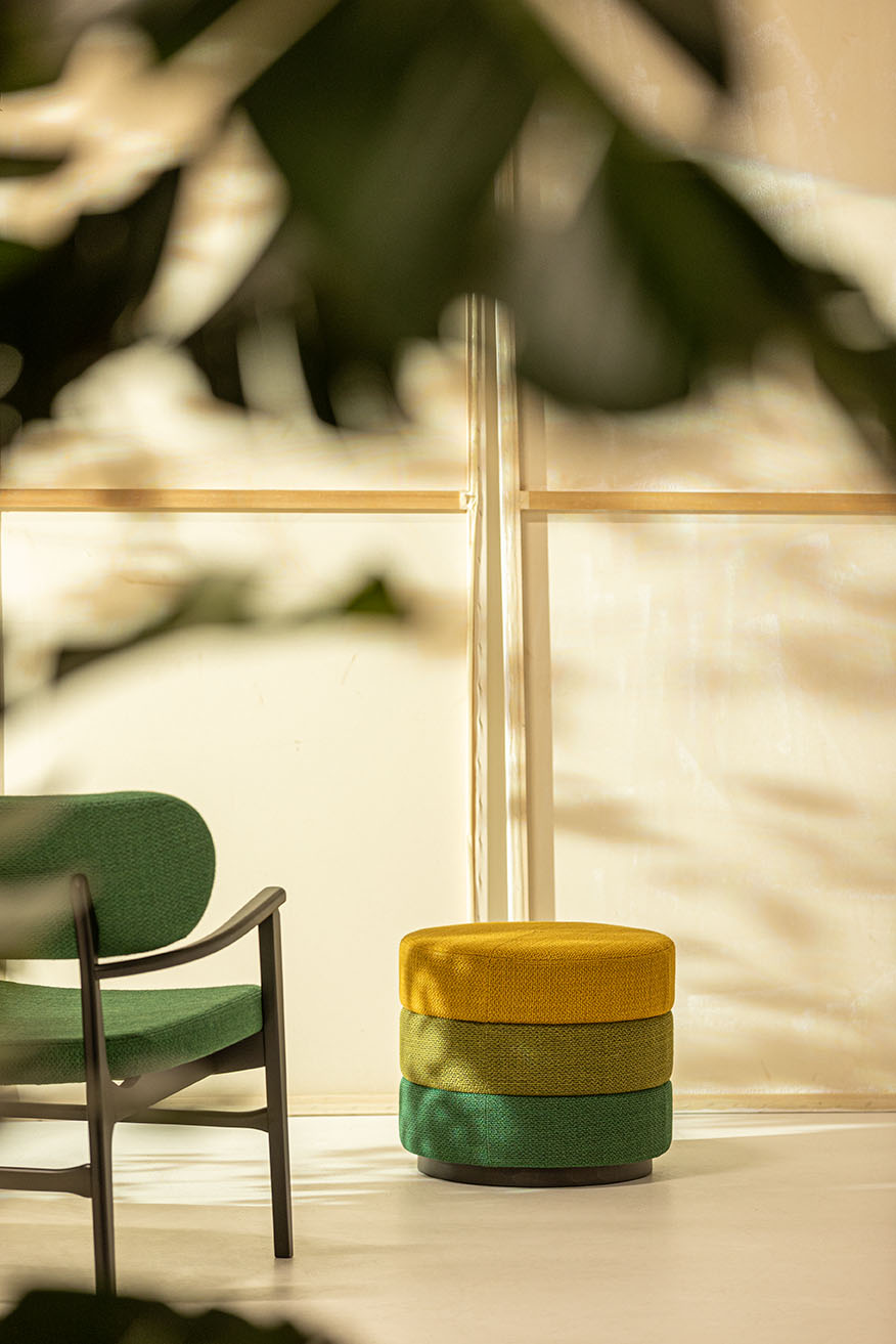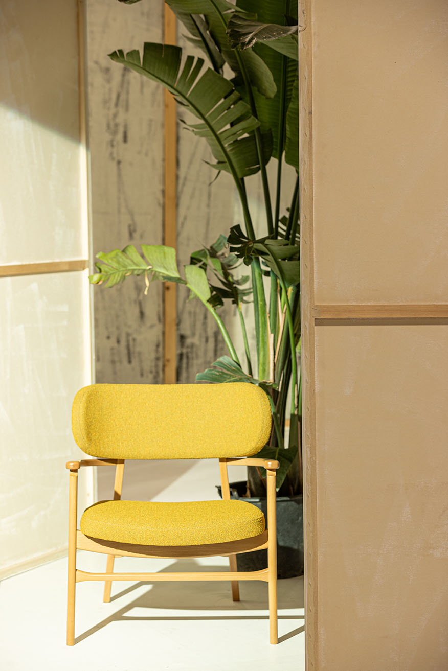 A new lounge chair with an upholstered seat and backrest, offering a contemporary design for lounge spaces.